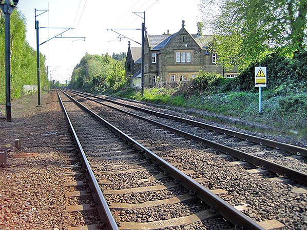 Photo by Richard Allen from his Flickr photostream ![]() Looking north-east from the level crossing in April 2005 at the former signal box. After its closure in January 1979 the base of the box was retained as a relay room – as has happened at several other disused stations on the East Coast main line in Northumberland. A BR Corporate Identity nameplate has been affixed.