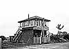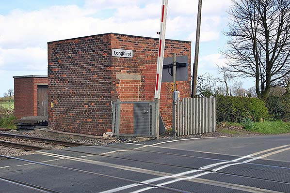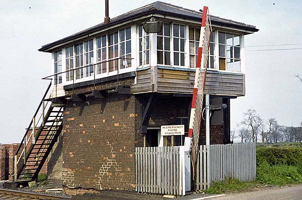 Photo by John Mann ![]() The NER signal box at Longhirst station level crossing is seen in 1979, looking north-east shortly after its closure. The nameplate has been removed from the box. The structure has an N1 base with wooden top and overhangs, and it housed a 26-lever G W Stevens frame. The crossing gates had been replaced with barriers on 19 October 1975, and on 12 November 1978 the signal box was relegated to operating as a gate box, released by Morpeth. The frame was cut back to 23 levers when the crossing was modernised. The box closed in January 1979 but the base has been retained as a relay room.