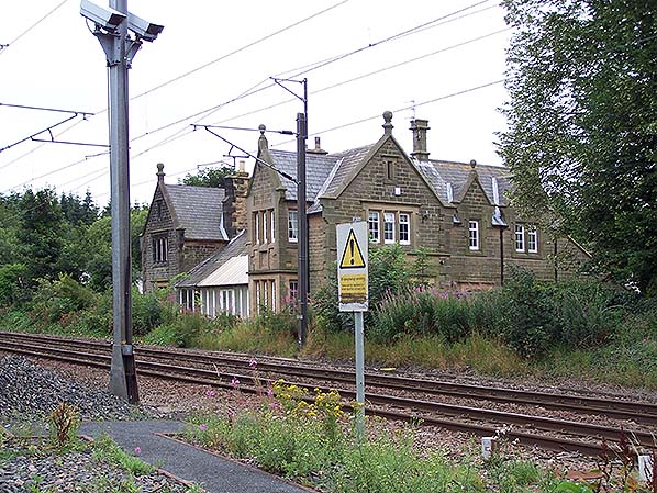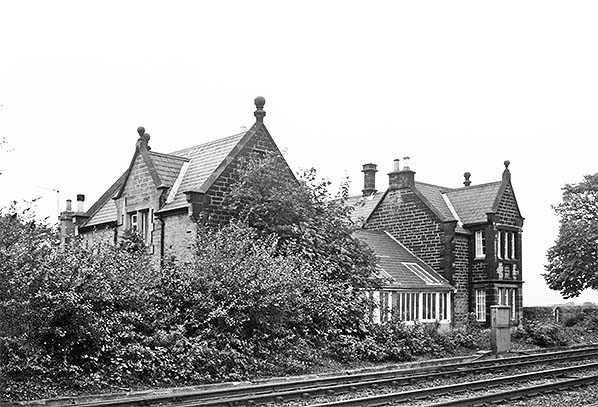 ![]() Longhirst station building, looking north-west across the tracks of the East Coast main line in September 1978. The Newcastle & Berwick Railway did not economise on the station buildings which opened with the line in 1847. As much attention was given to the architectural details on the side elevations (to the south and north) as to the more prominent platform and forecourt façades.