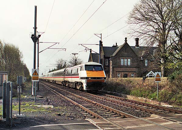 Photo by Alan Lewis from his Ipernity photo gallery ![]() The 06.00 Kings Cross - Edinburgh express (Class 91 - 91022) speeds past the disused Longhirst station in April 1992.