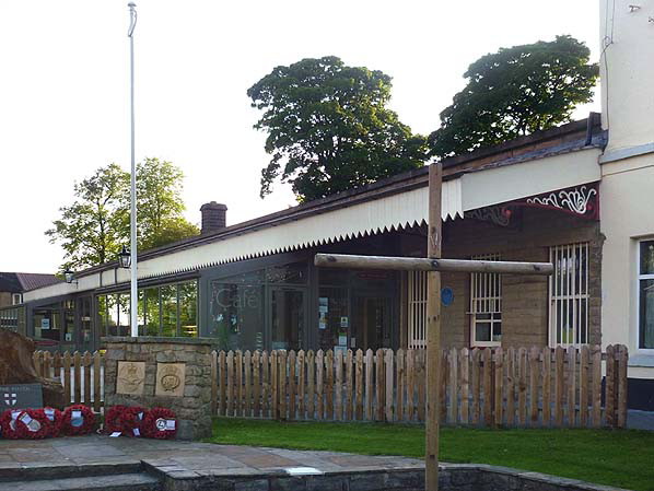 looking south towards the heritage visitor centre at Longridge station in May 2012. In the foreground is the Longridge War Memorial.