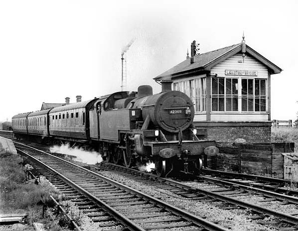 ![]() A very rare visitor to the WLR by this date (5 September 1964) is one of the last Fowler 4MT 2-6-4 tanks, No. 42369, seen here passing Longton Bridge's signal box with the 12.18pm Saturday-only Southport - Preston. Following withdrawal of all freight facilities in April 1964, the box was normally 'switched-out' at weekends, as was the case on this date.