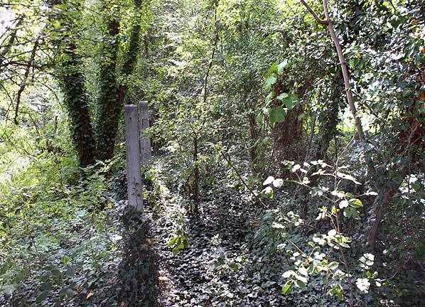![]() Looking west along Longton Bridge station's up platform at its west end in July 2011. This was the section of platform that was on the west side of Liverpool Road. The two concrete posts date from the time of the station being open.