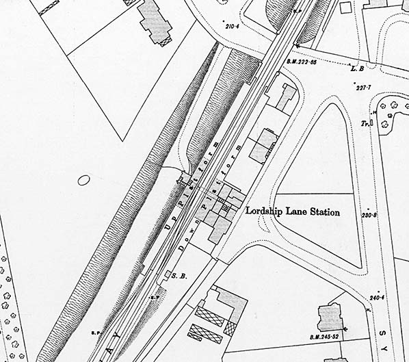 Notes: To meet conditions laid down by Dulwich College, the road overbridge was elaborately ornamented and the station house picturesquely styled with two steeply-gabled roofs over its red brick and stone. Elsewhere cost was kept down by using timber construction. The station was a short distance from Forest Hill station on the LBSCR main line, Lordship Lane had to share what little traffic this villa district produced.