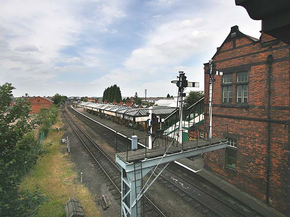 Looking north along the 'down' platform at Loughborough Central Station from the Great central Road bridge in July 2008