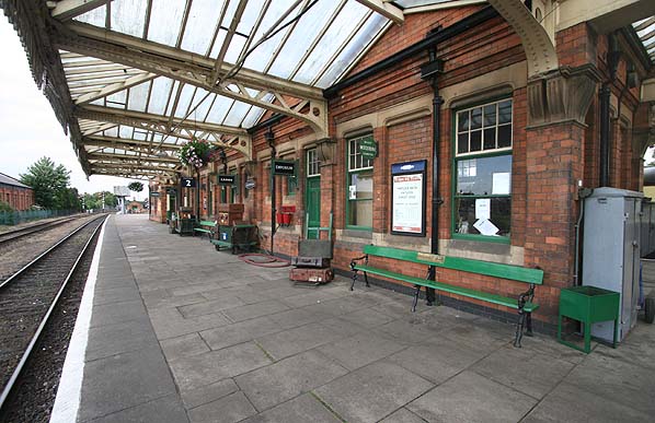 Loughborough Central Station looking north along the 'down' platform in July 2008. The emporium is on the right and beyond it the ladies waiting room