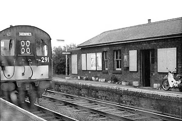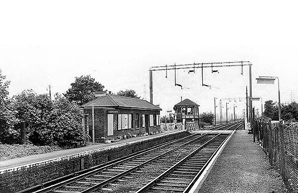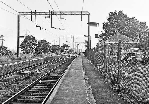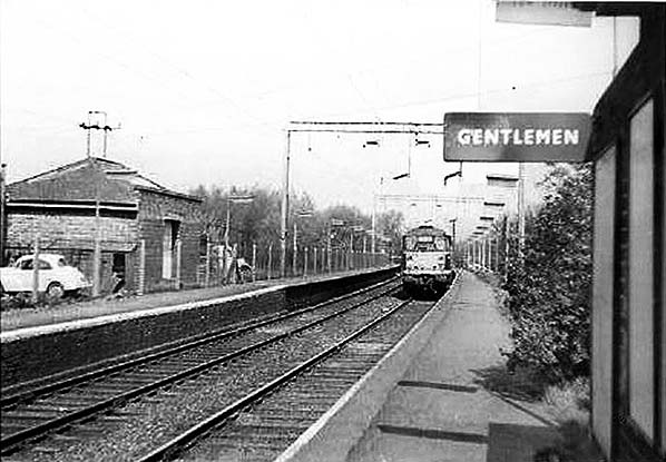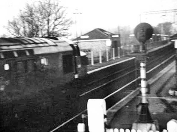 Photo from Jim Lake collection ![]() In the mid 1960s a Brush Type 2 passes Low Street, presumably with a goods working. Later designated Classes 30 and 31, this example lacks the four character headcode box so is probably one of the Pilot Scheme D5500 - D5519 batch. Obvious is the extension to the Down platform, the former Down goods loop once running behind it and serving the small goods shed. The Up platform, upon which the photographer stood, was lengthened earlier and presumably as a prelude to electrification.