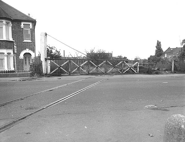 The Angel Road - Lower Edmonton, looking south from the Montagu Road level crossing in May 1978. The track can still be seen embedded in the road. The track here was still visible until at least July 1993 Photo by Nick Catford
