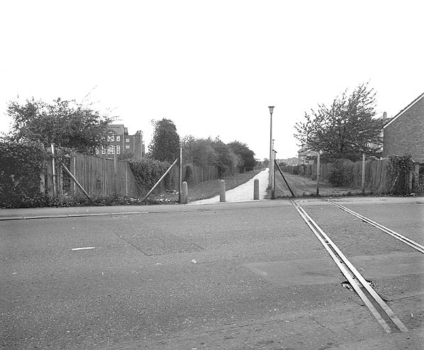 The Angel Road - Lower Edmonton, looking north from the Montagu Road level crossing in May 1978. The track can still be seen embedded in the road. The track here was still visible until at least July 1993 Photo by Nick Catford
