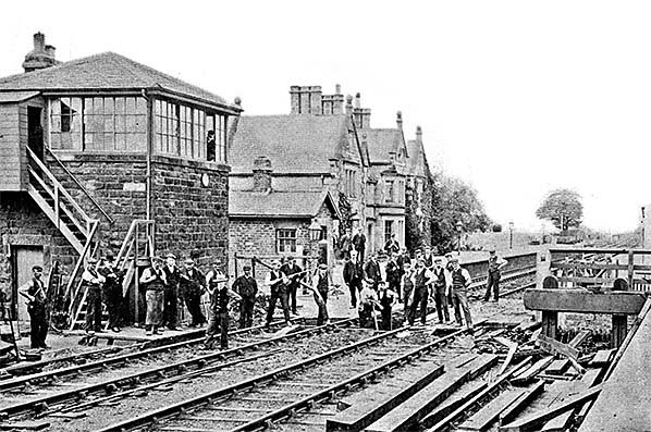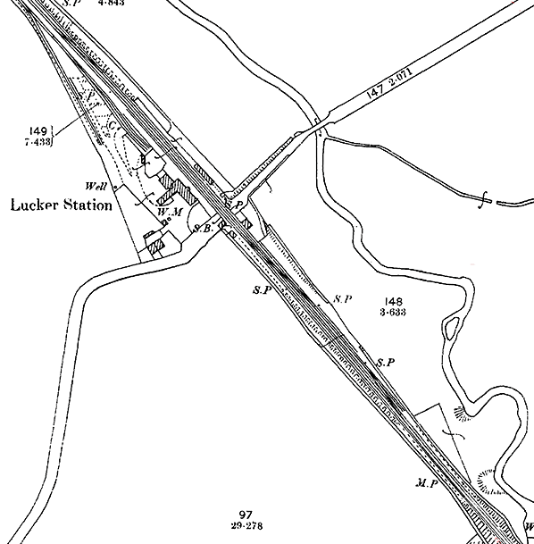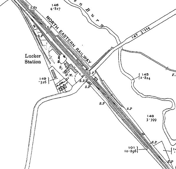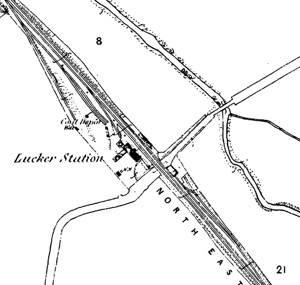![]() .Some construction or maintenance work is in progress at Lucker c1900-14. This view looking north-west from the goods loading bank includes the NER signal box, the level crossing and the enormous N&B station building. A small brick-built structure is immediately beyond the crossing; it is not indicated on the 1897 OS map and its purpose is not known