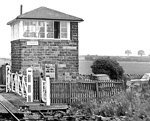 ![]() Lucker crossing gates and signal box on the down side of the tracks, looking south c1970. The N1-design box was constructed by the North Eastern Railway in 1873 and was to close in 1978, shortly after the gates were replaced with barriers.