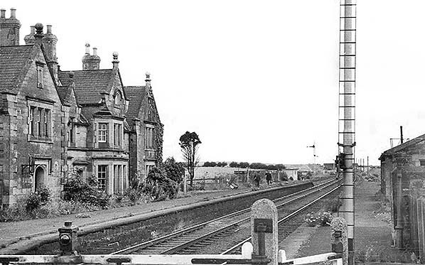 Photo from J W Armstrong Photographic Trust ![]() Lucker station looking north-west from the level crossing in 1958, five years after it had closed to passengers. The enormous ‘Jacobethan’ station building on the down platform is one of the finest designed by Benjamin Green for the Newcastle & Berwick Railway, and this lavish provision was required by a covenant made between the controller of the Newcastle & Berwick Railway, George Hudson, and the Duke of Northumberland. It combines the pair of projecting wings, found on a number of the N&B stations, with the central projecting bay windows and gable seen at Chathill and Stannington, resulting in a building of great dignity. On the up platform the stone wall of the waiting shelter can be seen, with a lamp standard and empty lantern cradle and a signal post in the foreground. We are fortunate that the photographer visited just in time to record the platforms (which probably were removed in 1959) and the buildings which were demolished in 1960.