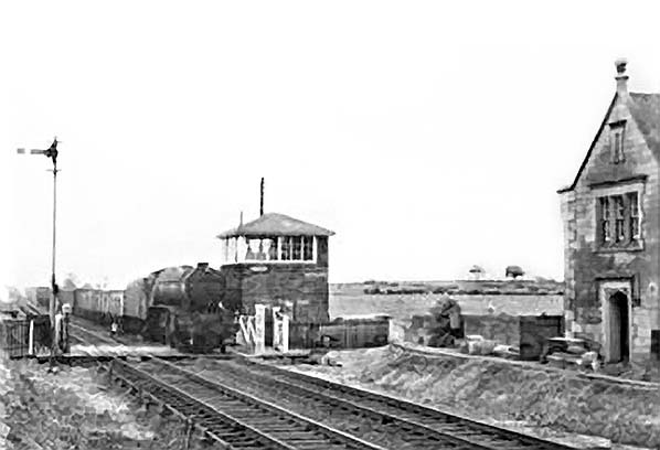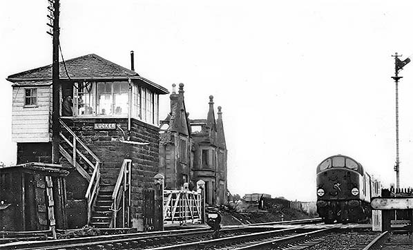 ![]() Demolition of the main building is in progress in July 1960, as an unidentified ‘Type 4’ English Electric diesel loco (later Class 40) hauls an up train through the Lucker station. The NER N1-style signal box – and the signalman - are seen in the left foreground.