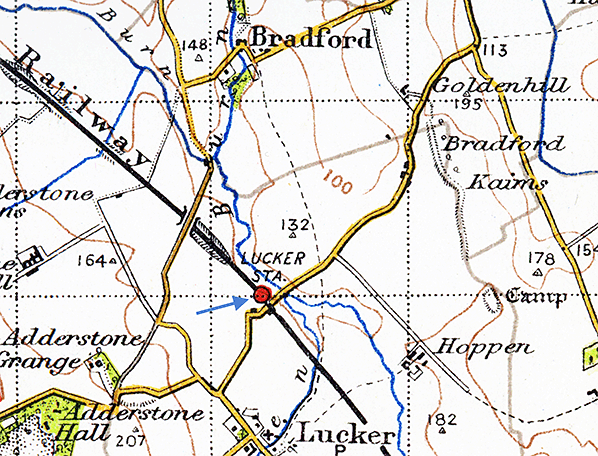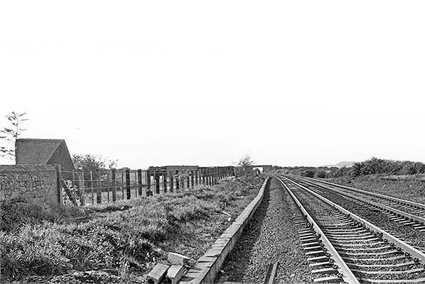 ![]() Looking north-west at the site of Lucker station c1971. The site of the down platform is on the left, and a short section of its back wall can be seen. On the right, the up platform has also been demolished.