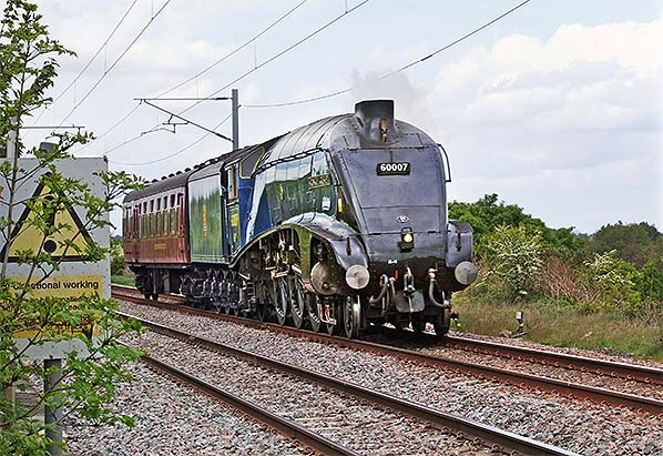 Photo by John Mann ![]() On 19 May 2009 A4 Pacific (4-6-2) No.60007 ‘Sir Nigel Gresley’ has just surprised the photographer by appearing at Lucker level crossing, hauling a single coach southwards. The derelict goods loading bank is behind the loco. The Gresley-designed locomotive was built at the LNER’s Doncaster works in November 1937, and it first carried the number 4498 but was later renumbered ‘7’. After nearly 30 years of prestige main line service she was withdrawn from 61B, Aberdeen Ferryhill shed, on 1 February 1966. The loco is owned by the Sir Nigel Gresley Preservation Group and has worked on heritage and main line railways.