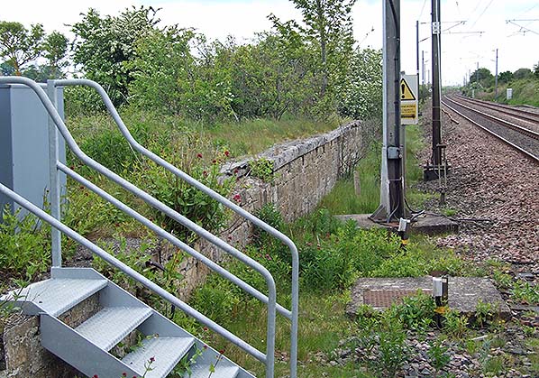 ![]() Station Name: LUCKER![]() The former goods loading bank is still in place south-east of the level crossing on the up side of the main line tracks at Lucker station, but it has been colonised by vegetation. Goods traffic ceased in June 1965 and this photograph was taken in May 2009.