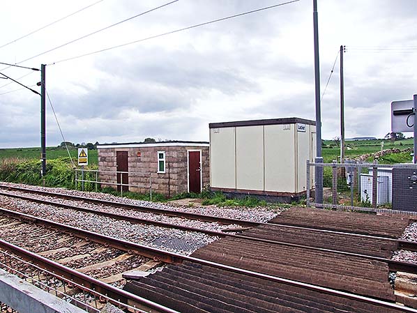 ![]() Station Name: LUCKER![]() The stone base of the former signal box adjacent to the level crossing continues in use as a relay room. The view is south-west from the crossing in May 2009.