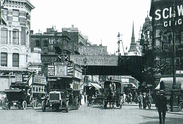 Ludgate Circus in the 1920's with the railway bridge over Ludgate Hill