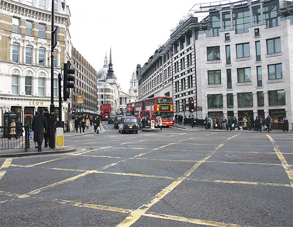 Looking up Ludgate Hill from Ludgate Circus in December 2005. The railway bridge would have gone over the first bus.