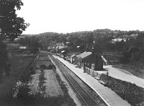 ![]() Lustleigh Station looking south in the early 20th century. A wide strip of land was purchaed for use as a loop line but this was never used for a loop and the land was use for a station garden.