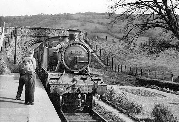 Photo by David Murray-Rust ![]() The Murray-Rust children stand on the platform as the brnch passenger train 4179 is a Collett 2-6-2T built at Swindon in 1949. and at this time allocated to Newton Abbot shed. She was withdrawn on 28 February 1965 from Tyseley shed after only 16 years and scrapped at Cohens in Kingsbury in October that year.