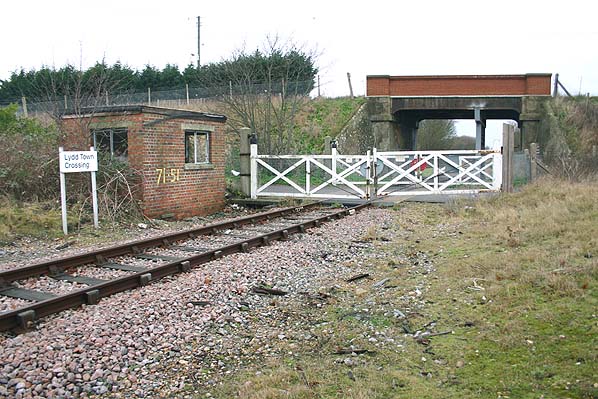 The level crossing and overbridge north of Lydd Town Station in January 2006. The brick building houses the ground frame. Photo by Nick Catford