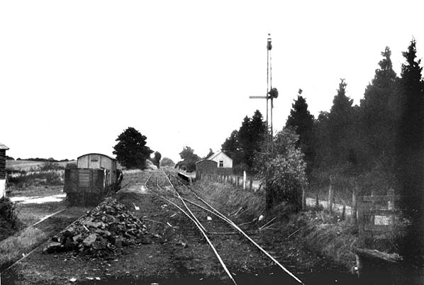 Looking south-east from the road towards Lydham Heath station in October 1931. The access footpath is seen on the right. The corner of the timber goods shed is seen on the left.
