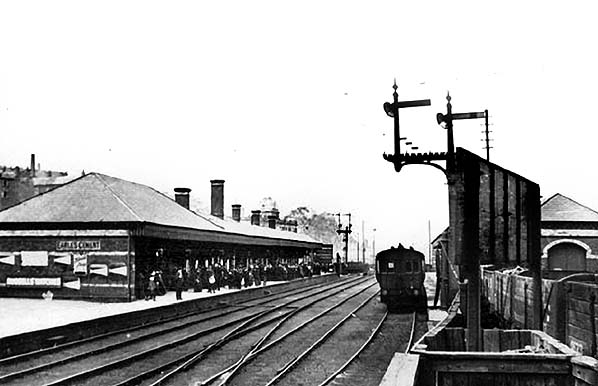 Macclesfield Central opened on 1 July 1873 and the original MB&MR facility closed. The station was located on an embankment on a section of line that was originally double track. There were lengthy single-storey brick buildings with hipped roofs on both platforms, each with a centrally located entrance portico leading into the booking hall, which itself stood forward of the building line. Each platform had a generous verandah a screen wall at the southern end. The west platform verandah was formed by the hipped roof of the platform buildings, whilst on the east side the verandah had its own hipped roof. On both platforms the verandah was given a deep, serrated and pierced valance. On the east platform a lengthy screen wall decorated with blind arcading extended north of the building as a back wall to the platform.