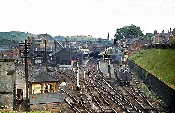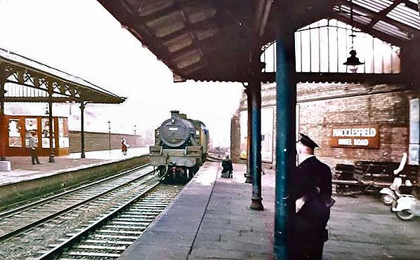 Colourised photo from Pete Smith collection ![]() Looking south from Macclesfield Hibel Road station from Beech Lane tunnel in the late 1960s. This view shows the cramped layout of the station with the NSR motive power depot squeezed between the LNWR goods yard (largely out of view behind the depot) and carriage sidings on the far left.
