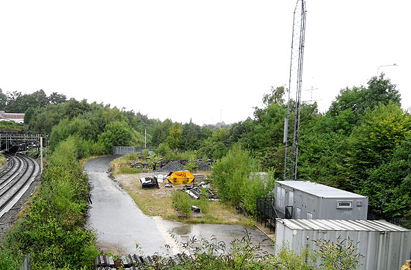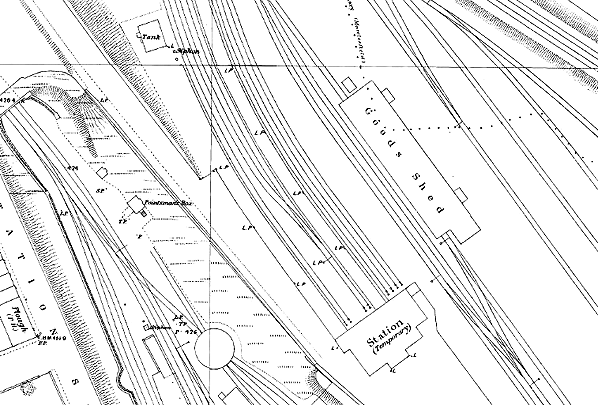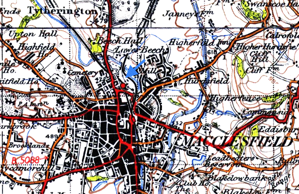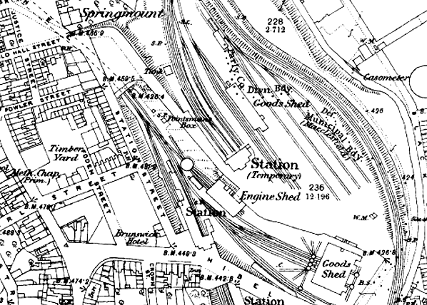 All efforts to create a joint station with the LNWR came to nothing and the MC decided to build a station of its own to the south of the LNWR station on the NS line. A connecting line of ¼-mile was built in 1873 which bypassed the temporary station to the east and formed a junction with the NS on the north side of Buxton Road. A new station called Macclesfield Central opened on 1 July 1873 and the original MB&MR facility closed. After closure the passenger facilities became part of the goods station.