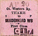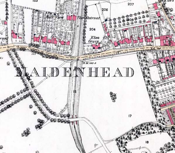 The station at Maidenhead was initially known as Maidenhead (Wycombe Branch) up to c1866 after which it was named Maidenhead Boyne Hill. The station was actually located on the south side of Castle Hill (the Bath Road) in the western part of the town which was known as Boyne Hill. Maidenhead & Taplow station was renamed Taplow on 1 May 1869 to avoid confusion with the Wycombe Railway's station.
