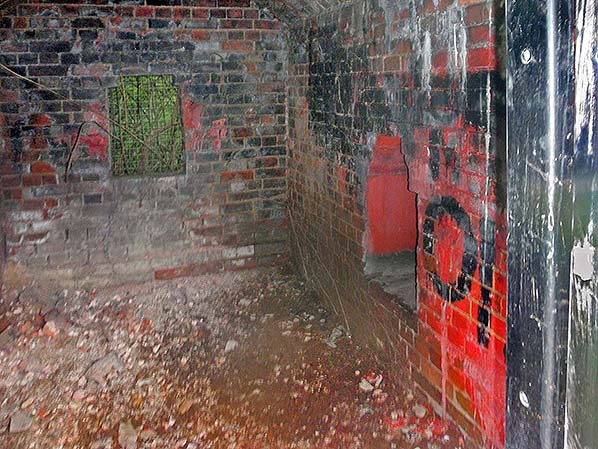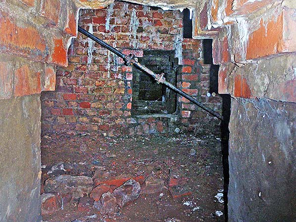 Although there is no trace of Boyne Hill station at track level the mysterious vaults beneath the pedestrian bridge still exist and the two arches, one bricked up and the other with a wooden door can be seen in the side of the bridge. The vaults were opened for an engineers inspection in 2015 and 2016. The bridge consists of a series of vaults along Castle Hill, below the footway and across the railway bridge. There are nine vaults in total, with the two end ones being the arches which were blocked up and are visible from the roadside and from the railway; within these two, there are small openings on the railway side of the bridge. Two of the other seven vaults are completely sealed. At some point in the past minor repairs have been carried out which included installing supporting bars and creating holes between the vaults to allow access to them all. The headroom in the vaults does not appear sufficient for passenger use and it seems likely they had no connection with the station.