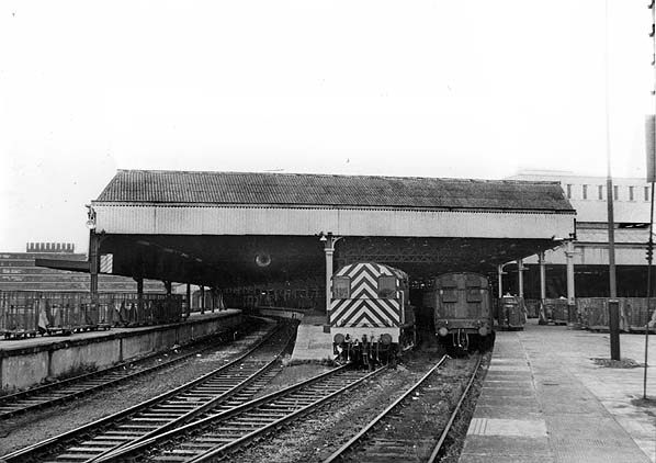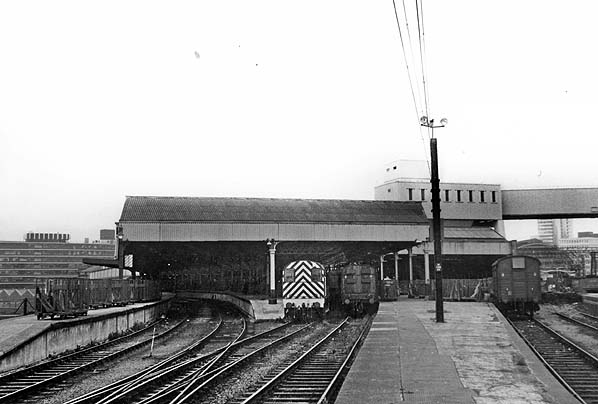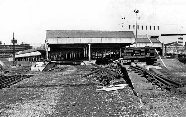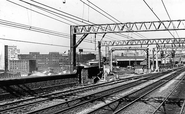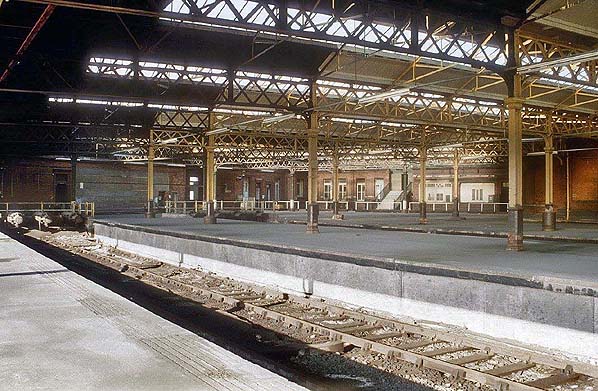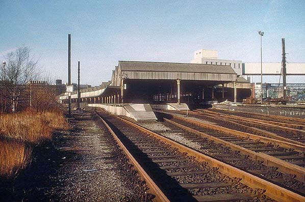 ![]() Manchester Mayfield station looking west in June 1980 during the period when it was a parcels depot. The view was taken from the east end of platform 1 at which a rake of parcels vans stands. A class 08 locomotive is seen on shunting duties. A parcels DMU stands at platform 3 within the trainshed and further vans are stabled at platform 5. Photo by John Mann ![]() A similar view as the photograph above also from June 1980. To the right can be seen the conveyor bridge which was used to transfer parcels between Mayfield and Manchester Piccadilly. Photo by John Mann ![]() A view looking west at Manchester