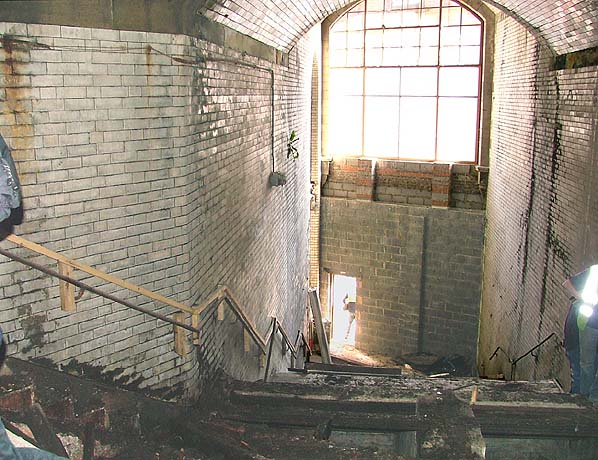 ![]() Looking down to the station entrance at the corner of Melbourne Street and Trafalgar Street in March 2005. These stairs led up to the island platform (7 & 8) and to a subway to Platform 1. The stairs have now been stripped out and a restaurant is being built (2005) in the old station entrance. This scene was used in the film 'Get Carter' - see still from the film below. Photo by Michael Brady ![]()