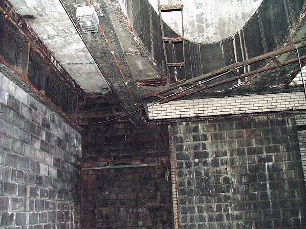 The eastern wall and ceiling of the mezzanine level within the Manors East tunnel system in March 2005. The oval shaped space in the roof which is marked on the map, which dates from the period between 1887 and 1909 before Manors North was opened. The oval was probably a sky-light which was filled when the new signal box was built over it. There are two areas of breeze blocks - that in front of the camera is the bottom of the steps up to platforms 7 & 8, while the modern wall to the left of the shot is the truncated subway towards Manors multi-storey car park and Croft Lane to the North.