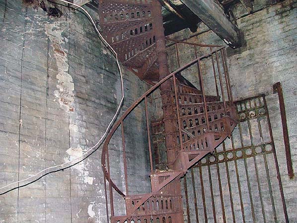 Old spiral staircase under platforms 7 & 8 in March 2005. Jonathan Clark writes: : I really can't place the spiral staircase at all. The walls are plain, rather than glazed brick which could suggest that it was not intended as a public space. I can identify a rather large sliding metal gate behind the staircase in the open position, complete with the collapsible bar which would allow it to be secured. A rough guess would be that it is situated somewhere on the mezzanine level, probably on the subway between the landing halfway up the long stairs to Platform 9 and the bottom of the stairs to Platforms 7 & 8. The rather opaque accounts posted on the LNER forum suggest that there was a system of gates and doors within the tunnels, allowing various sections to be closed without shutting the Croft Lane subway which I suspect was a public Right of Way.