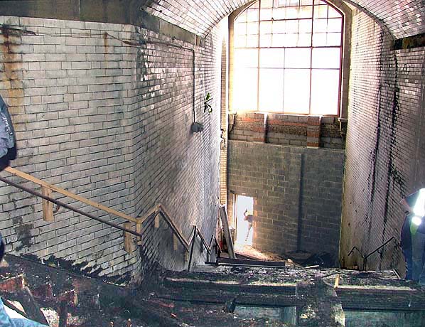 Looking down to the station entrance at the corner of Melbourne Street and Trafalgar Street in March 2005. These stairs led up to the island platform (7 & 8) and to a subway to Platform 1. The stairs have now been stripped out and a restaurant is being built (2005) in the old station entrance. This scene was used in the film 'Get Carter' - see still from the film below .