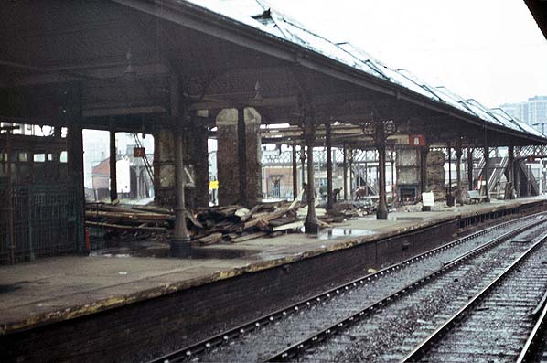 Manors (East). Looking east from platform 9. The platform roofing on island platforms 7 and 8 is under way in November 1979. Photo by Alan Lewis from his Flickr photostrea