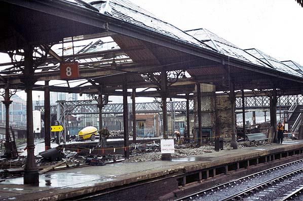 Manors (East) in November 1979. The platform buildings and roofing are being demolished on island platforms 7 and 8. Manors (North) can be seen in the background of the northward-facing photograph. Photo by Alan Lewis from his Flickr photostrea