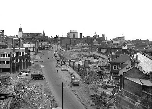 Trafalgar Street and the exterior of Manors (North) seen from the multi-storey car park to the south of the station in 1972. Demolition is under way in preparation for major road works which