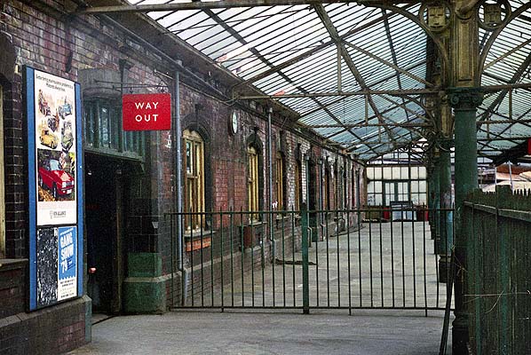 Manors (North) platform 1 and concourse, looking north in April 1979. Although trains had ceased to call at this platform, it remained in use as the main entrance to the station (through the building, to the left). Passengers then had to navigate across the station to the former East platforms 6 to 9.