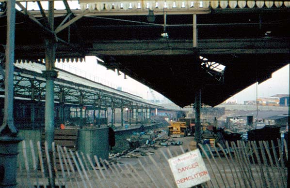 Manors (North). In November 1979 removal of the roofing on former bay platforms is in progress. The photographer is standing at the head of platforms 4 (left face) and 5.