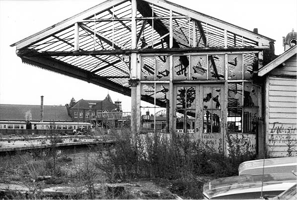 Manors (North) had one of the distinctive North Eastern Railway screens to provide extra shelter at the end of the platform roofing. By 1983 this feature, seen looking south, has been heavily vandalised.