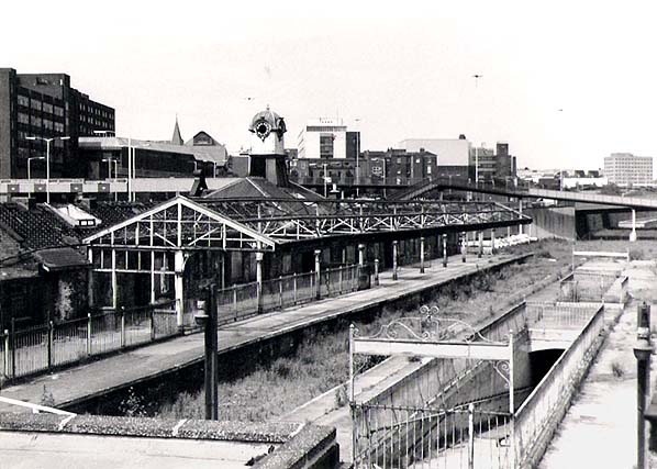 Looking north in September 1985 from the footbridge across platforms 2/3 at Manors North (with a subway entrance visible) towards platform 1, still with its building and verandah in place. Photo by Keith Ward