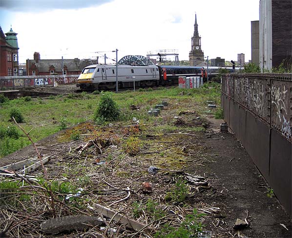 Looking south along platform 1 at Manors North in May 2012. An inter-city train passes a remnant of platform 7 on the East Coast Main Line. Photo by Ali Ford