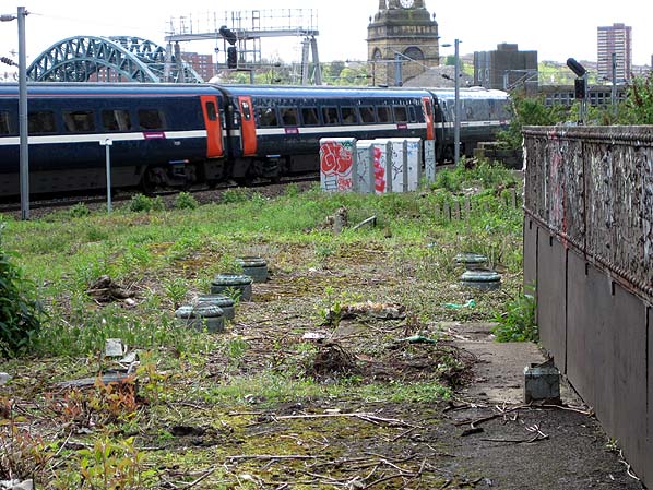 Truncated supports for the footbridge at the south end of platform 1 at Manors North in May 2012. Photo by Ali Ford