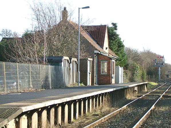 Marchwood station in January 2006, presumably from the level crossing with a zoom lens which would explain the apparently short platform at its Totton end. Of the signals, that on the tall dolly controls the line to Fawley and that on the short dolly the spur to the military port. The spur is single track near the junction and then fans out to four tracks. Tracks then part company to pass on the east and west sides of the military site before ending on two of the port's jetties. There are also a number of other sidings including to the locomotive shed which is located to the south of the site.