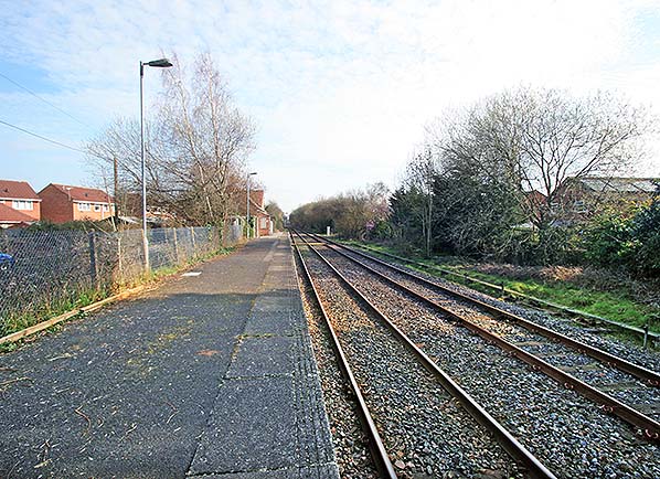 Looking south-east along Marchwood station platform towards Fawley in November 2014.