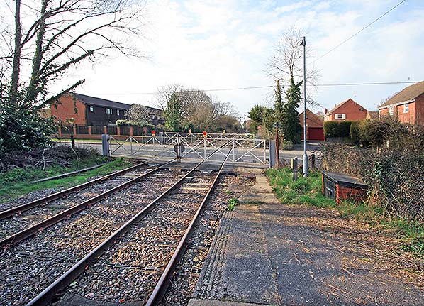 A view from the end of Marchwood's platform towards Main Road level crossing in November 2014. The gates, surmounted by battery-powered lamps, are of mainly metal construction and appear quite flimsy in comparison with traditional wooden swinging gates. The posts are made from lengths of RSJ (Rolled Steel Joist). The devices between the rails bear the word 'Strail'. KRAIBURG STRAIL GmbH & Co. KG is a German company supplying level crossing panels, walkways, fencing and so on. Level crossing panels can be rubber, wood or concrete. The purpose of boxes between and facing the rails is unclear but they might be axle counters to inform the signalman when the rear of a train, which may stop in either of the loops through the station, is clear of the level crossing. Point rodding can be seen on the left; this passes beneath the road via a conduit in the usual manner. With Network Rail's currently ongoing scheme to replace mechanical signal boxes, point rodding and signal wires are rapidly becoming things of the past insofar as the national network is concerned. The process is, however, no new thing and had been ongoing well before British Railways days albeit confined to specific