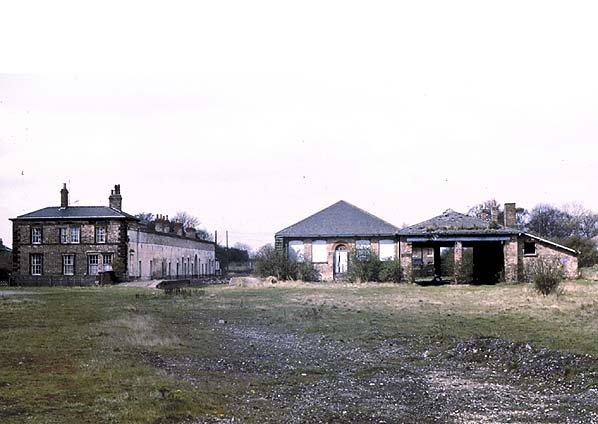 Looking west towards Market Weighton station in April 1976. The stationmaster's house is seen on the left. The building in the middle is the original goods shed with the engine shed on the right.